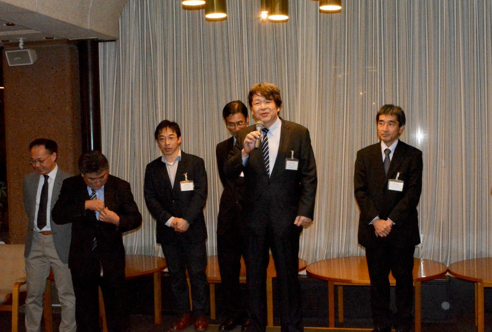 懇親会は津本浩平先生の司会で進行し,尾嶋副会長のご挨拶の後,斉藤泰和先生(昭和31年卒)の乾杯のご発声でスタートしました。昨年の懇親会で,卒業生の参加者は多いのに,現役の教員陣の参加が少ないという話題が出たことから,今年は改善を図り,現在,工学部化学・生命系で教鞭をとられている先生方にも多数,ご参加頂きました。化学生命工学専攻の専攻長の山東信介先生には化学・生命系3学科の近況報告として,進学振り分けにおける最近の状況,企業名を冠した博士課程の奨学生制度などをご紹介いただきました。企業で活躍する卒業生と現役の先生方の交流を活性化するのは学生支援のためにも大事なことだと感じました。続いて,これも今年からの新しい趣向ですが,新しく化学・生命系に着任された先生方に壇上で自己紹介いただきました。